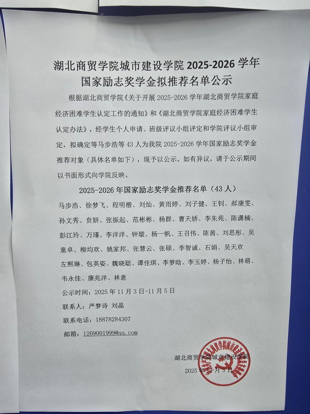 根据湖北商贸学院《关于开展2025-2026学年湖北商贸学院家庭经济困难学生认定工作的通知》和《湖北商贸学院家庭经济困难学生认定办法》,经学生个人申请、班级评议小组评定和学院评议小组审定,拟确定等马步浩等32人为我院2025-2026学年国家励志奖学金推荐对象(具体名单如下),现予以公示。